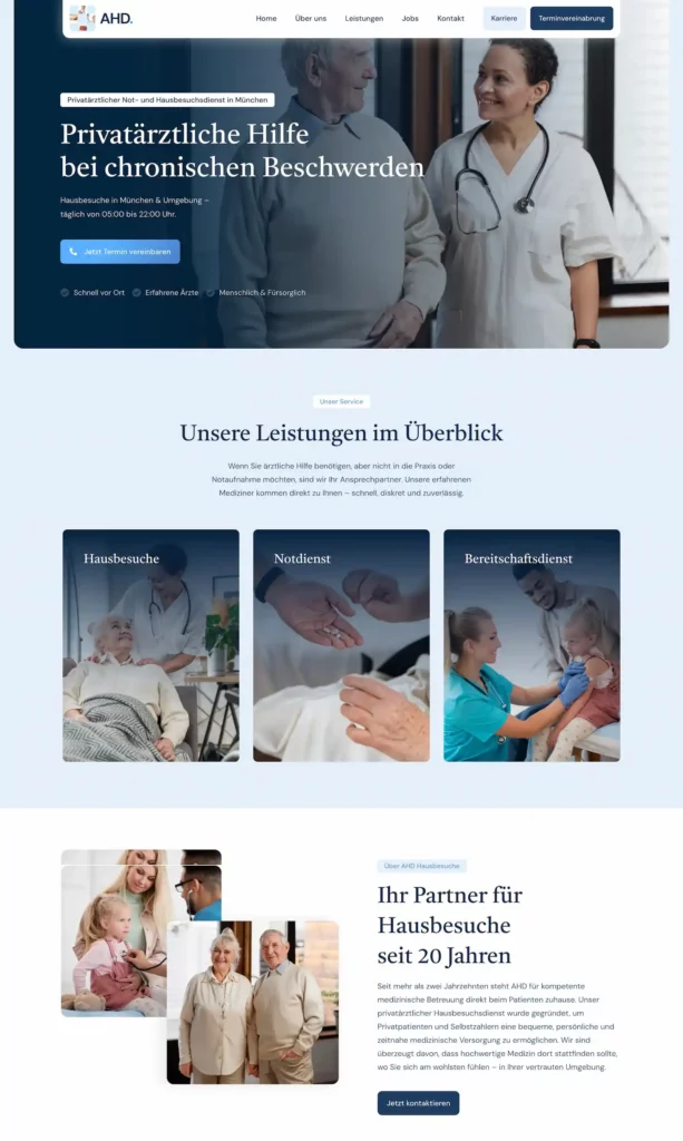Für AHD Hausbesuche haben wir eine SEO-starke Website entwickelt, die exakt auf die Suchintention im Bereich hausärztlicher Akutversorgung ausgerichtet ist. Bereits nach kurzer Zeit erreichten wir für Top-Keywords wie „Privatärztlicher Notdienst München“ die Nr. 1 bei Google – und generieren seitdem konstant hochwertige Anfragen aus München und Umgebung.