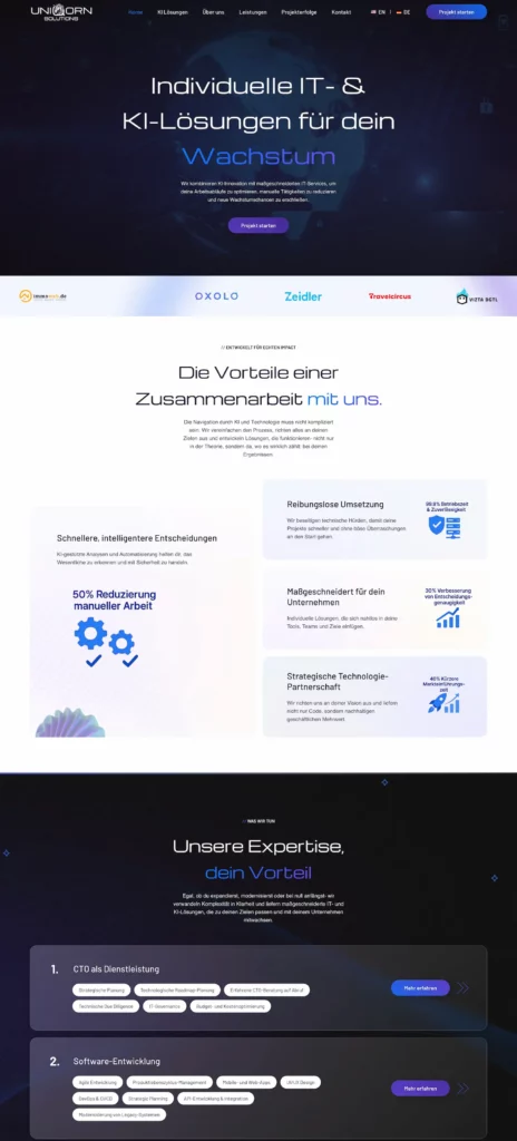 Für Uniqorn Solutions entwickelten wir eine zeitgemäße Website, die ihre Spezialisierung auf individuelle IT- und KI-Dienstleistungen klar und überzeugend darstellt. Visuell ansprechend und funktional strukturiert verbindet der Auftritt die Bereiche Softwareentwicklung, KI-Lösungen und Teamerweiterung mit einer modernen typografischen Gestaltung und einer klaren Nutzerführung. Darüber hinaus wurde die Markenidentität von Uniqorn Solutions durch die digitale Umsetzung gestärkt und die Positionierung im Technologieumfeld geschärft.